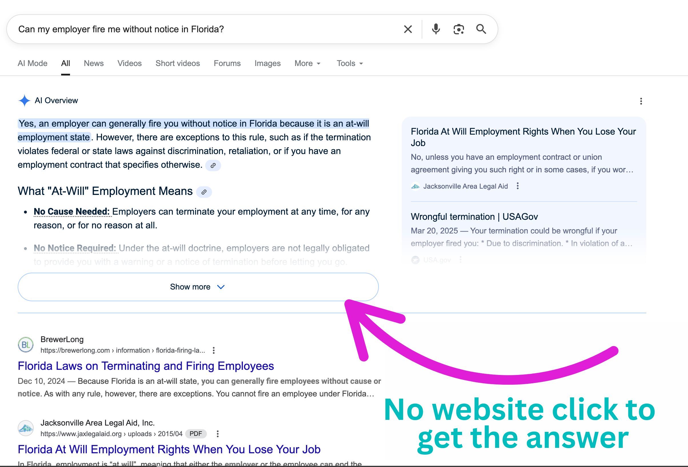 When you Google a legal question like “Can my employer fire me without notice in Florida?”, the very first thing you see isn’t a website link — it’s Google’s AI Overview.