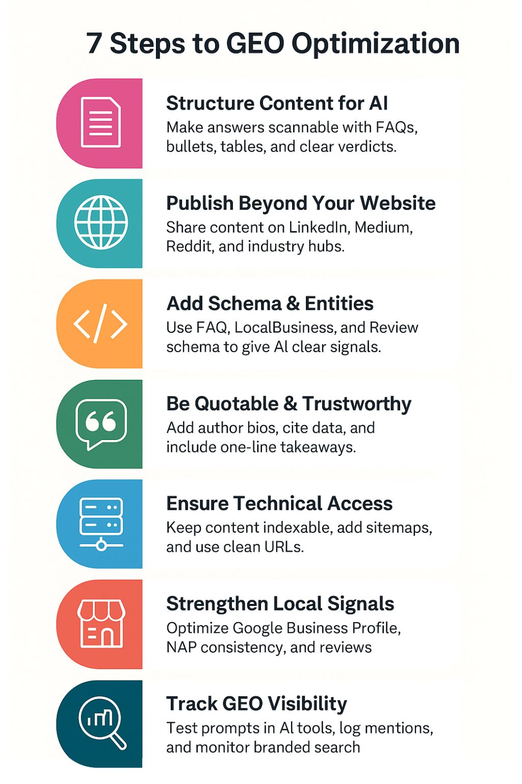For any business that depends on local customers, GEO is heavily tied to local SEO. AI Overviews rely on consistent data across directories to answer “near me” queries.