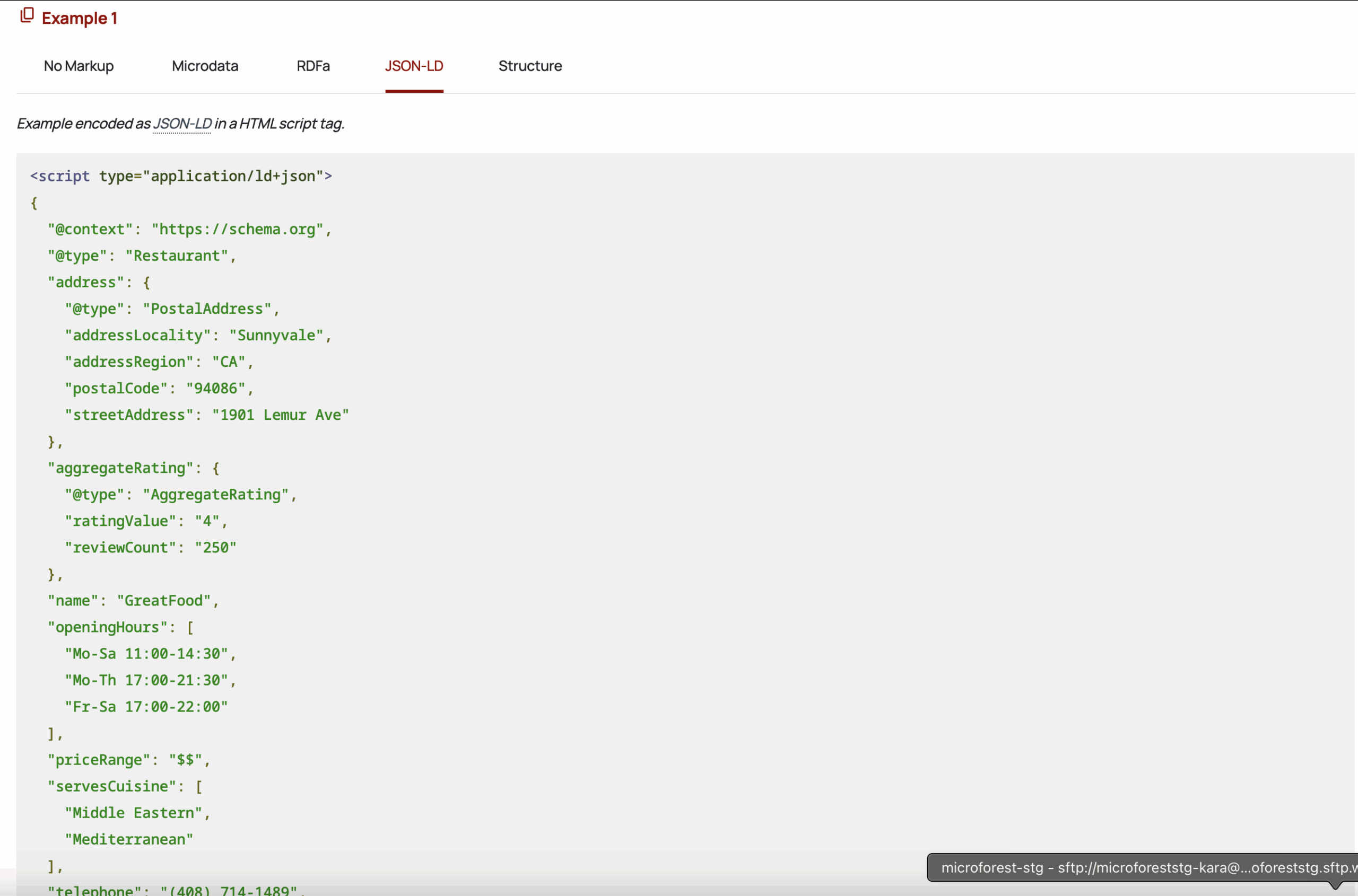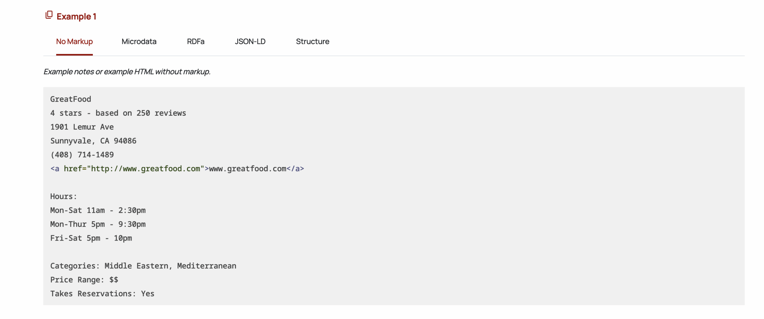 The example you shared is a Restaurant (a subtype of LocalBusiness) and it’s labeling the essentials so Google understands them instantly: